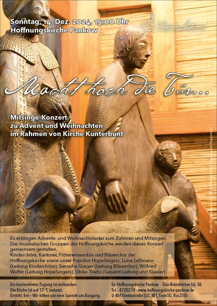 Kinderchöre, Kantorei, Flötenensemble und Bläserchor der Hoffnungskirche sowie unser Popchor HopeSingers, Luise Leßmann (Leitung Kinderchöre), Samaiha Greger (Leitung Bläserchor), Wilfried Walter (Leitung HopeSingers), Ulrike Triebs (Gesamt-Leitung und Klavier)